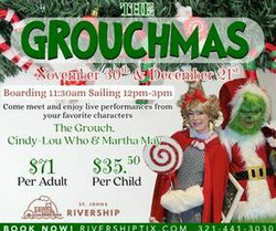 Grouch Lunch Cruises sail from 12–3 PM ET on November 30 and December 21. Tickets are $71.00 per adult and $35.50 per child, with free parking available at the dock. For tickets, visit RivershipTix.com or call 321-204-0274. Optional VIP packages are available for added holiday magic.